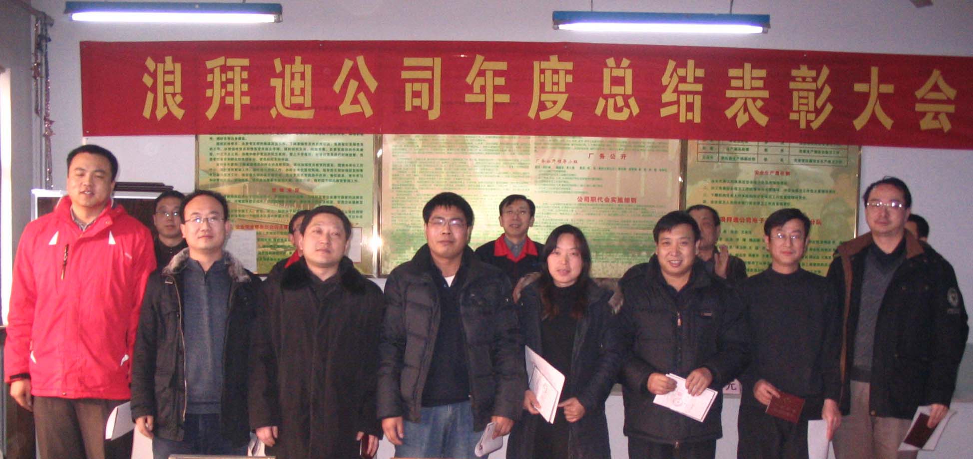 “金牛送福绿柳迎春,鼓乐和鸣龙狮劲舞。”在春节即将到来之际浪拜迪全体员工召开了年度总结表彰大会。2009年1月21日下午三点,全体员工准时到达四楼职工之家。大会第一项公司董事、人力资源总监公布08年度公司获得的荣誉称号,通报08年度公司奖惩情况。经统计2008年全年公司共获得国家、省、市、区年度受表彰奖励的优秀员工名单,他们分别是销售状元杨建亮;回款状元周京魁;服务状元王耀辉,全年服务效率高;优秀员工两名,分别是赵占磊和唐艳生。当选为优秀团队的两个部门是采购部和财务级的荣誉14项,两人获得个人荣誉。全年共奖励5次,处罚1次。第二项由公司董事、总工程师公布2008部。之后公司董事会成员向受表彰的团队、个人颁发奖状、证书和奖金。
